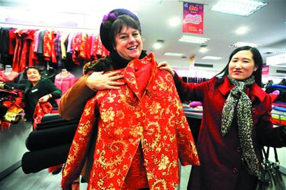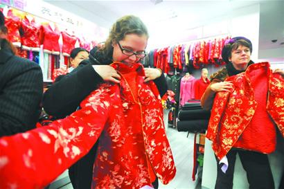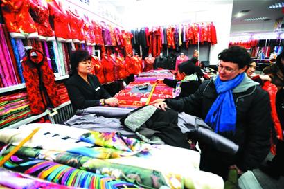 穿上喜慶的唐裝,感受濃濃的中國年,這是不少島城市民迎接新年的做法。伴隨著龍年春節(jié)的來臨,置備唐裝的除了市民,還多了不少金發(fā)碧眼的外國朋友,更有的“老外”一口氣訂做了10件唐裝,要拿回國當(dāng)禮物送人。 倆月訂單超過一年 昨日,記者來到臺東三路的千川百貨,這里是島城最大的唐裝訂做商場之一。做唐裝的師傅們正忙著給顧客量身、裁剪。唐裝店老板邵曉燕告訴記者,每年春節(jié)前兩個(gè)月都是店內(nèi)生意最忙碌的時(shí)候,近兩個(gè)月接到的顧客訂單趕上了平時(shí)10個(gè)月的總和,每天都有五六十筆。邵曉燕說,來做唐裝的以中老年人和準(zhǔn)備結(jié)婚的小情侶居多。 “很多20多歲的小伙小嫚都覺得唐裝挺時(shí)尚”。邵曉燕說,相比去年,今年的唐裝在款式和質(zhì)地上和以往都有所不同,“今年主要是以龍的圖案為主,很受顧客歡迎,質(zhì)地上絲綢的賣得比較好。 ”記者了解到,一件普通的唐裝價(jià)格約400元,質(zhì)地好的價(jià)格上千元。商場的徐經(jīng)理告訴記者,一些在青島工作和來青島旅游的老外也對唐裝很青睞,每年春節(jié)前都有很多日本、韓國、歐美等國的外國朋友前來訂做唐裝。 老外一次訂做十套 在一家唐裝攤位前,記者見到了正在挑選唐裝的美國朋友勞瑞和蘇珊。兩人拿出一套套唐裝在身前不停地比劃,并交流著意見。蘇珊告訴記者,她們都是一年前來的青島,在青島一所高校任教,在美國時(shí)就很喜歡中國年,為了真切地感受濃濃的中國年,她和朋友決定各自訂做一套龍年唐裝,“唐裝太漂亮了,我想做幾件寄回去送給美國的朋友。 ”千川百貨商場徐經(jīng)理告訴記者,很多老外都迷上了唐裝,一名非洲客戶一口氣訂做了十來套唐裝,帶回去分給親戚朋友。記者隨后走訪了徐州路、鞍山路等多家唐裝專賣店了解到,不少專賣店在唐裝上增加了一些龍年的元素,有的在衣服上繡上龍的圖案。徐州路一家唐裝專賣店的工作人員告訴記者,現(xiàn)在定做一套普通的唐裝,只需300元就可以了,對普通市民來說并不貴。很多市民甚至自己設(shè)計(jì)了樣式,然后要求裁剪師進(jìn)行制作。 員工加班趕制唐裝 唐裝店老板邵曉燕告訴記者,每年過節(jié)前三個(gè)月開始,就有顧客開始預(yù)訂,而唐裝的制作有時(shí)間限制,一般都要趕在年前裁制出來?!邦櫩投枷脍s在年前穿新衣,很少有過完年再要的?!鄙蹠匝嗾f,平均每件唐裝的剪裁需要一個(gè)半小時(shí),尤其年末定做的量比較大,所以每天都加班加點(diǎn),有時(shí)一天一個(gè)工人要裁剪八九套唐裝。記者看到,女青年小張正在仔細(xì)地挑選唐裝。她告訴記者,過兩個(gè)月她就要結(jié)婚了,男友的老家在濰坊,家里老人想把婚禮辦得喜慶些,特意囑咐她穿身有傳統(tǒng)特色的唐裝參加婚禮?!袄先瞬惶矚g白色婚紗,還是覺得紅色喜慶,這不我專門來挑件,看了一圈發(fā)現(xiàn)唐裝確實(shí)很漂亮,既喜慶又上檔次。 ”