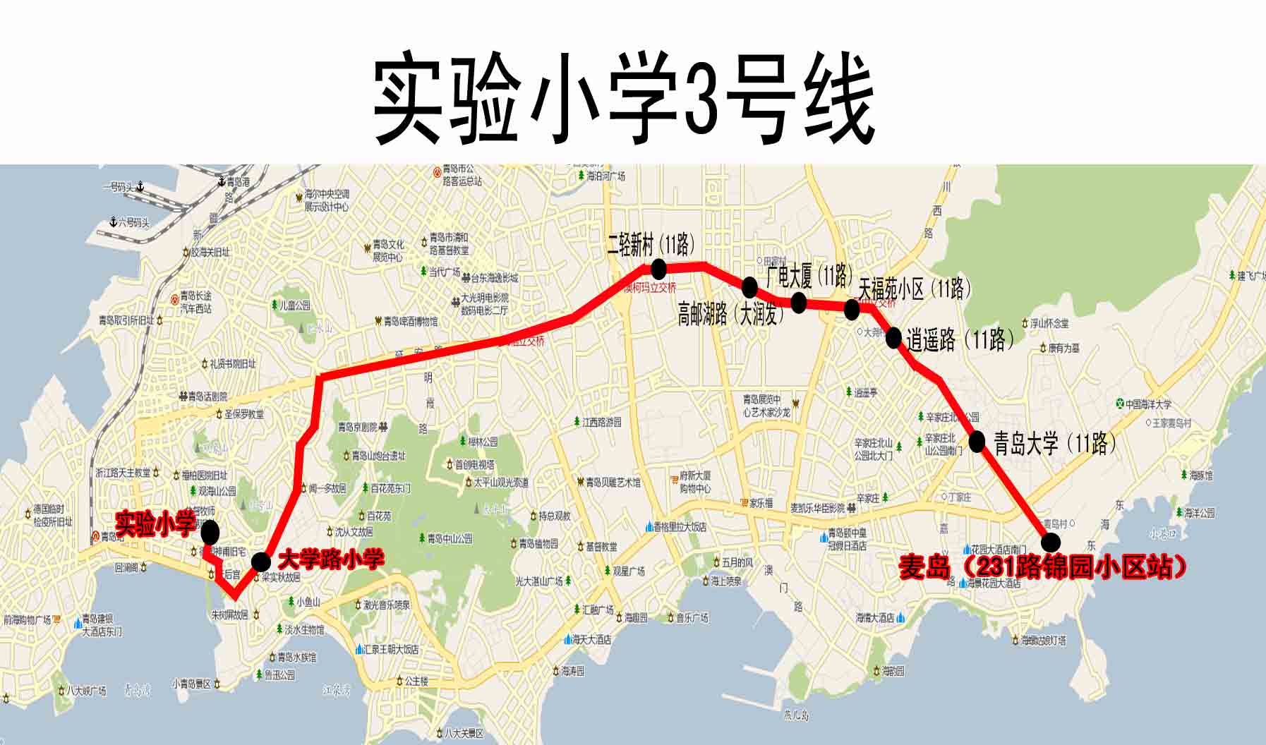 ??? ①麥島(231路錦園小區(qū)站)、②青島大學(xué)(11路站)、③逍遙路(11路站)、④天福苑小區(qū)(11路站)、⑤廣電大廈(11路站)、⑥高郵湖路(大潤(rùn)發(fā))、⑦二輕新村(11路站),直達(dá)學(xué)校。