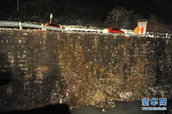 1月5日,救援人員查看翻車事故現(xiàn)場。蘭海高速貴州境內(nèi)貴定縣到福泉市路段4日18時30分左右發(fā)生一起大客車翻車事故,至4日22時,現(xiàn)場救援工作基本結(jié)束,事故已造成16人死亡。(新華社記者 劉續(xù) 攝)