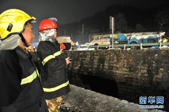 1月5日,消防人員在翻車事故現(xiàn)場(chǎng)組織救援工作。蘭海高速貴州境內(nèi)貴定縣到福泉市路段4日18時(shí)30分左右發(fā)生一起大客車翻車事故,至4日22時(shí),現(xiàn)場(chǎng)救援工作基本結(jié)束,事故已造成16人死亡。(新華社記者 劉續(xù) 攝)