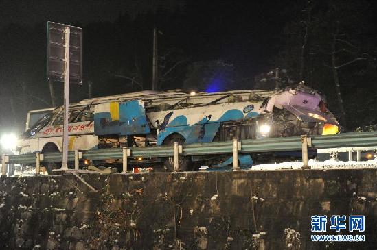 1月5日,事故車輛已經(jīng)被吊起停放在路邊。蘭海高速貴州境內(nèi)貴定縣到福泉市路段4日18時(shí)30分左右發(fā)生一起大客車翻車事故,至4日22時(shí),現(xiàn)場(chǎng)救援工作基本結(jié)束,事故已造成16人死亡。(新華社記者 劉續(xù) 攝)