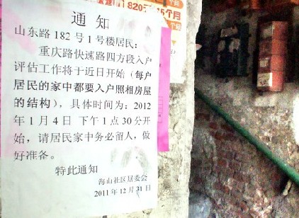 青島重慶路快速拆遷啟動(dòng)評(píng)估 1.選定房屋征收評(píng)估機(jī)構(gòu),簽訂委托評(píng)估協(xié)議;2.房屋征收評(píng)估機(jī)構(gòu)接受委托方提供的相關(guān)資料,進(jìn)行前期工作;3.進(jìn)行實(shí)地勘察;4.評(píng)估測(cè)算;5.確定、公布評(píng)估結(jié)果。這是島城新頒布房屋征收評(píng)估管理辦法中的五大房屋征收評(píng)估流程。記者 1月4日得知,其中四方區(qū)段兩千余戶拆遷居民已經(jīng)啟動(dòng)了入戶評(píng)估,評(píng)估工作計(jì)劃在春節(jié)前結(jié)束統(tǒng)計(jì)。 記者1月4日得到重慶路快速路工程的最新消息,該工程四方區(qū)段兩千余戶涉及拆遷的居民啟動(dòng)了入戶評(píng)估,本次入戶區(qū)別于之前的入戶摸底,將直接為房屋征收價(jià)格的確定提供第一手資料。記者1月4日來(lái)到了山東路182號(hào),記者看到,山東路182號(hào)有多棟居民樓,在1號(hào)居民樓的顯著位置已經(jīng)貼上了入戶評(píng)估的相關(guān)通知。 “通知只有1號(hào)樓這邊貼了,其他幾個(gè)樓沒(méi)有?!睆木用駱墙?jīng)過(guò)的市民告訴記者。記者看到,在通知的顯著位置,居委會(huì)用大黑字標(biāo)明了入戶評(píng)估的具體工作為:每戶居民的家中都要入戶照相房屋的結(jié)構(gòu)。 記者了解到,日前,島城發(fā)布了關(guān)于房屋征收的最新政策,自2011年12月2日開始,在國(guó)有土地上實(shí)施的房屋征收評(píng)估活動(dòng)將按照《青島市城鄉(xiāng)建設(shè)委員會(huì)國(guó)有土地上房屋征收評(píng)估管理辦法》和《青島市城鄉(xiāng)建設(shè)委員會(huì)國(guó)有土地上房屋征收評(píng)估技術(shù)規(guī)范》執(zhí)行,辦法中明確規(guī)定了房屋征收評(píng)估的五大流程:1.選定房屋征收評(píng)估機(jī)構(gòu),簽訂委托評(píng)估協(xié)議;2.房屋征收評(píng)估機(jī)構(gòu)接受委托方提供的相關(guān)資料,進(jìn)行前期工作;3.進(jìn)行實(shí)地勘察;4.評(píng)估測(cè)算;5.確定、公布評(píng)估結(jié)果。 按照島城房屋征收政策:同一征收項(xiàng)目的房屋征收評(píng)估工作,原則上由一家房屋征收評(píng)估機(jī)構(gòu)承擔(dān)。房屋征收范圍較大的,可以由兩家或兩家以上房屋征收評(píng)估機(jī)構(gòu)共同承擔(dān)。 四方區(qū)相關(guān)拆遷部門工作人員介紹說(shuō):“我們?cè)谌ツ昃鸵呀?jīng)確定了幾家房屋評(píng)估機(jī)構(gòu),目前四方區(qū)段涉及到的房屋征收居民已經(jīng)進(jìn)入了入戶評(píng)估的階段,幾家評(píng)估機(jī)構(gòu)將共同參與對(duì)房屋的評(píng)估工作。”記者1月4日采訪到四方區(qū)阜新路街道辦事處負(fù)責(zé)重慶路快速路工程房屋征收的相關(guān)負(fù)責(zé)人,該負(fù)責(zé)人介紹說(shuō):“阜新路街道辦事處涉及重慶路快速路工程拆遷工作的有三個(gè)社區(qū),總共涉及到的居民大概有400戶左右,我們的入戶摸底在前期已經(jīng)完成了,今天啟動(dòng)的是入戶評(píng)估工作,入戶評(píng)估將分片區(qū)、分步驟實(shí)施,首先進(jìn)行評(píng)估的是小村莊的幾十家拆遷居民,下午就是山東路那邊。” 除了多家評(píng)估機(jī)構(gòu)參與評(píng)估以外,按照房屋征收相關(guān)規(guī)定,房屋評(píng)估可以同時(shí)選用兩種以上評(píng)估方法評(píng)估的,應(yīng)當(dāng)選用兩種以上評(píng)估方法評(píng)估,并對(duì)各種評(píng)估方法的測(cè)算結(jié)果進(jìn)行校核和比較分析后,合理確定評(píng)估結(jié)果。 計(jì)劃春節(jié)前完成四方區(qū)段入戶評(píng)估 入戶評(píng)估流程之后,就是評(píng)估價(jià)格的確定和發(fā)布,記者1月4日采訪了解到,重慶路快速路工程房屋征收四方區(qū)段共涉及兩千余戶居民,“阜新街道辦事處大概400戶左右的居民。入戶評(píng)估統(tǒng)計(jì)工作計(jì)劃在本月10日結(jié)束,但是評(píng)估價(jià)格并不確定什么時(shí)候出來(lái)?!备沸侣方值擂k事處負(fù)責(zé)重慶路快速路工程房屋征收的相關(guān)負(fù)責(zé)人介紹說(shuō)。 記者隨后以拆遷居民身份撥打電話向四方區(qū)有關(guān)部門求證,四方區(qū)相關(guān)拆遷部門工作人員介紹說(shuō):“整個(gè)重慶路快速路工程四方區(qū)段的房屋征收入戶評(píng)估工作預(yù)計(jì)在春節(jié)前結(jié)束,因?yàn)楦鱾€(gè)街道的情況不同,進(jìn)度可能有所不同,下一步就是確定評(píng)估價(jià)格,但是這個(gè)評(píng)估價(jià)格可能需要春節(jié)后才可以公布。” 在房源的確定方面,該工作人員表示只有等具體的評(píng)估價(jià)格出來(lái)之后,才能最終確定,記者隨后提出市場(chǎng)房?jī)r(jià)的下跌趨勢(shì)是否會(huì)對(duì)評(píng)估價(jià)格產(chǎn)生影響,該工作人員解釋說(shuō):“這個(gè)問(wèn)題不用擔(dān)心,評(píng)估價(jià)格如果受到了市場(chǎng)房?jī)r(jià)的影響,那么房源價(jià)格也肯定會(huì)有所調(diào)整?!?/p> 按照新出臺(tái)的島城房屋征收方案,評(píng)估機(jī)構(gòu)對(duì)被征收房屋和產(chǎn)權(quán)調(diào)換房屋原則上實(shí)行分戶評(píng)估。房屋征收范圍確定后,房屋征收部門應(yīng)當(dāng)將擬征收項(xiàng)目的名稱、范圍、房屋征收評(píng)估機(jī)構(gòu)選定方式等相關(guān)事項(xiàng)在征收范圍內(nèi)公告。據(jù)了