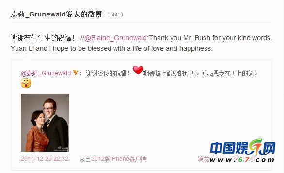 近日,突然閃電結(jié)婚的袁莉收到了來自美國前總統(tǒng)的祝賀,在微博上,袁莉高調(diào)感謝來自布什總統(tǒng)的祝賀。并表示期待穿上婚紗,舉辦婚禮的時刻。