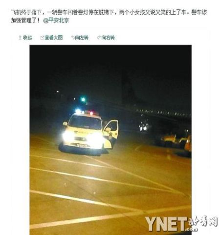 網(wǎng)友拍攝的警車(chē)接機(jī)畫(huà)面。 ????昨天,一位網(wǎng)友在網(wǎng)絡(luò)微博上發(fā)帖稱(chēng),昨天凌晨他在首都機(jī)場(chǎng)下飛機(jī)時(shí),看見(jiàn)一輛閃爍著警燈的警車(chē)停在舷梯旁,接走了兩名20多歲的女性乘客,并有警察幫忙提行李。有說(shuō)法稱(chēng),這是下了夜班的候機(jī)樓民警,用警車(chē)接他的女兒和同學(xué)。很多網(wǎng)友認(rèn)為警車(chē)進(jìn)機(jī)場(chǎng)跑道接人非常不妥,有“公車(chē)私用”之嫌。 ????警燈閃爍接走兩個(gè)姑娘 ????昨天,記者聯(lián)系到了網(wǎng)友“蘇堤的西湖”,他介紹說(shuō),他前天夜間乘坐吉祥航空HO1251次航班,從上海飛往北京,抵達(dá)北京首都機(jī)場(chǎng)時(shí)已經(jīng)是23點(diǎn)40分左右。“蘇堤的西湖”說(shuō),飛機(jī)停穩(wěn)后,機(jī)上的乘客們看到有一輛閃爍著警燈的警車(chē),停在了飛機(jī)的舷梯下面。“蘇堤的西湖”說(shuō),當(dāng)時(shí)他以為,這可能是一輛押運(yùn)犯人之類(lèi)的警車(chē)。不一會(huì)兒,兩個(gè)大約20多歲的姑娘有說(shuō)有笑地上了警車(chē),一位警察還從車(chē)上下來(lái),幫著兩個(gè)姑娘拿著行李包?!疤K堤的西湖”說(shuō),兩個(gè)姑娘上車(chē)后,這輛警車(chē)就閃爍著警燈開(kāi)走了。 ????部分乘客質(zhì)疑“警車(chē)私用” ????“蘇堤的西湖”說(shuō),這輛警車(chē)的牌照是“京AXXXX警”。他拍攝的照片上,這輛警車(chē)停在機(jī)場(chǎng)跑道上,左前側(cè)的車(chē)門(mén)開(kāi)著,車(chē)大燈和車(chē)頂?shù)木療舳奸_(kāi)著。據(jù)他回憶,當(dāng)時(shí)天氣特別冷,又是深夜。他看到這兩個(gè)小姑娘直接就上了警車(chē),他和其他乘客卻只能擠擺渡車(chē),感覺(jué)“非常不舒服”。他對(duì)記者表示,當(dāng)時(shí)擺渡車(chē)上估計(jì)有一百多人,以為這輛警車(chē)是在押運(yùn)犯人,就都盯著。結(jié)果看到警車(chē)接走的是兩個(gè)小姑娘,大家都很氣憤。“蘇堤的西湖”氣憤地表示:“你接機(jī)也就罷了,卻閃著警燈,你到機(jī)場(chǎng)也就罷了,卻開(kāi)到了飛機(jī)旁?!?/p> ????回復(fù)稱(chēng)“將加強(qiáng)民警和警車(chē)管理” ????昨天下午6點(diǎn)左右,署名“北京邊防總站”的網(wǎng)友回復(fù)了“蘇堤的西湖”,稱(chēng)“我單位對(duì)此事高度重視,立即進(jìn)行了調(diào)查,將加大民警和警車(chē)的管理力度,對(duì)違反規(guī)定的民警批評(píng)教育,嚴(yán)肅處理?!敝埃@位網(wǎng)友還另有一條回復(fù),稱(chēng)“經(jīng)了解,開(kāi)警車(chē)的民警在候機(jī)樓值夜班結(jié)束后,恰逢其第一次出遠(yuǎn)門(mén)的女兒和同學(xué)從外地乘飛機(jī)回來(lái)。由于時(shí)間較晚,該民警便開(kāi)警車(chē)到停機(jī)坪飛機(jī)下,把她們接上車(chē)送到了場(chǎng)外?!?/p> ????這條微博引起了不少網(wǎng)友的轉(zhuǎn)發(fā)和評(píng)論。很多網(wǎng)友認(rèn)為警車(chē)接的這兩個(gè)姑娘有“背景”。看到了“北京邊防總站”的關(guān)于“接女兒和同學(xué)”的回復(fù)后,也有網(wǎng)友表示,即使是接女兒,也不應(yīng)該用公車(chē)。網(wǎng)友“惡貓”認(rèn)為:“紀(jì)律不是兒戲,要求必須嚴(yán)格,才能在百姓心中樹(shù)立一個(gè)良好的形象。” ????記者于昨天下午與相關(guān)部門(mén)多次核實(shí),但截至發(fā)稿時(shí),并未收到任何官方部門(mén)的回應(yīng)。 |