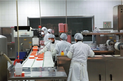 昨天,北京鐵路局動(dòng)車段配餐中心內(nèi),米飯裝盒正在進(jìn)行。(記者 王海欣 攝)