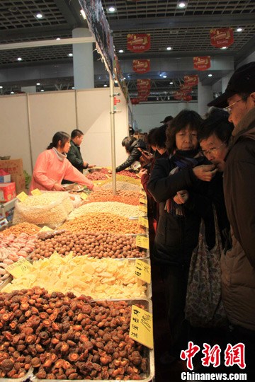 7日,2012年中國年貨購物節(jié)在山東省會濟(jì)南舉辦,“年貨大集”上,雞鴨魚肉、茶酒油醬、南北炒貨、糖餌果品,年貨種類繁多,泉城百姓紛紛前來置辦年貨。圖為市民在“年貨大集”上購買糖餌果品。陳慶芳攝