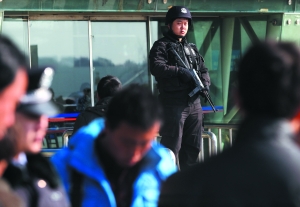 持槍特警在南京火車站候車室門口嚴(yán)密監(jiān)控來往人流。