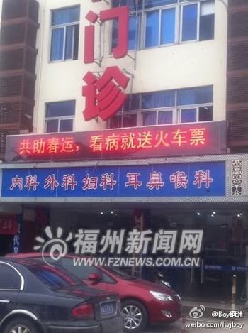 網(wǎng)友“Boy阿繼”供圖:“看病送火車票”(早上10許拍攝) 福州新聞網(wǎng)訊 8日10時(shí)許,網(wǎng)友“Boy阿繼”在微博上爆料:“看病送火車票,沒病都要去裝病啊!”該網(wǎng)友在這條微博下配了一幅圖,圖上一家門診下的LED屏幕上清楚地顯示著:“共助春運(yùn),看病就送火車票”。這一口號(hào)立即引發(fā)網(wǎng)友關(guān)注。 8日下午2時(shí)許,記者來到網(wǎng)友爆料的位于福州市倉山區(qū)的此醫(yī)院門口,果然看到醫(yī)院的LED屏幕上顯示著“共助春運(yùn),看病就送火車票”。記者在現(xiàn)場拍照,結(jié)果從醫(yī)院里闖出兩個(gè)人,強(qiáng)行奪走記者的相機(jī)并把所拍照片刪除。一名自稱是該門診機(jī)構(gòu)負(fù)責(zé)人的中年男士稱,他們只是在做促銷,門診方通過去火車站排隊(duì)、網(wǎng)絡(luò)預(yù)訂的方式為患者代買火車票。 記者看到一名為“陶陶-不淘”的網(wǎng)友也發(fā)微博稱:“剛才從那路口經(jīng)過,眼見為實(shí),拍下照片還有人上來兇巴巴的問我是干什么的!手機(jī)差點(diǎn)就被他們沒收咯。要我刪掉照片才放我走?!?/p> 下午3時(shí)許,記者再次來到這家醫(yī)院門口時(shí),其LED屏幕已經(jīng)不再顯示“看病就送火車票”的字樣。不過,記者從其醫(yī)院博客里仍看到:“凡在活動(dòng)期間,在醫(yī)院檢查、看病的外來務(wù)工人員,均可由院方代訂春節(jié)返鄉(xiāng)火車票。同時(shí),在院內(nèi)消費(fèi)數(shù)額達(dá)到2000元的患者,均可由院方贈(zèng)送一張返鄉(xiāng)火車票?!庇浾咭钥床橛勺稍兦芭_(tái)工作人員是否看病真的可以贈(zèng)送火車票這事,對方仍舊表示可以。 |