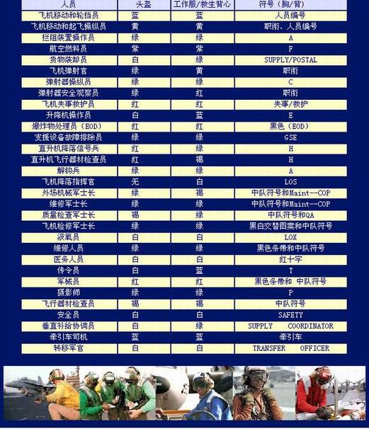 資料圖:在飛行甲板上, 穿黃色背心的是指示飛機(jī)起飛的, 穿綠色背心負(fù)責(zé)起飛前的安全檢查, 穿紅色背心的負(fù)責(zé)救火救援, 穿紫色背心的負(fù)責(zé)燃料, 穿紫紅色背心的負(fù)責(zé)彈藥, 穿棕色背心的負(fù)責(zé)飛機(jī)的安全降落。