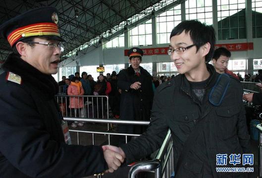 1月11日,威?;疖囌军h支部書記李鐵鋼(左)送別張平,向他表示感謝。春運(yùn)期間,在山東威?;疖囌?,有一名大學(xué)生免費(fèi)為需要幫助的人士訂票的事跡溫暖了很多人,人們親切地稱他為“訂票哥”。這名大學(xué)生名叫張平,山西朔州人,現(xiàn)在哈爾濱工業(yè)大學(xué)威海校區(qū)讀大四。2011年12月31日晚,張平通過電話訂票系統(tǒng)訂到了回家的火車票,體會到電話訂票的便捷。但同時他也發(fā)現(xiàn),先進(jìn)的訂票方式由于宣傳不到位,讓一些上歲數(shù)的老人、文化程度不高的農(nóng)民工或身有殘疾的人們無所適從。為此,張平萌生了免費(fèi)幫助人們訂票的想法。新年伊始,張平的身影就出現(xiàn)在火車站,通過電話,幫助人們訂票。幾天下來,張平成功訂票400多張,許多路途遙遠(yuǎn)的旅客在他的熱心幫助下,順利踏上回家的旅途。 1月11日是張平回家的日期,在上車之前的時間里,他依然在威?;疖囌編腿擞喥保米约旱膼坌?,溫暖他人回家的路…… 新華社發(fā)(于啟波攝) |