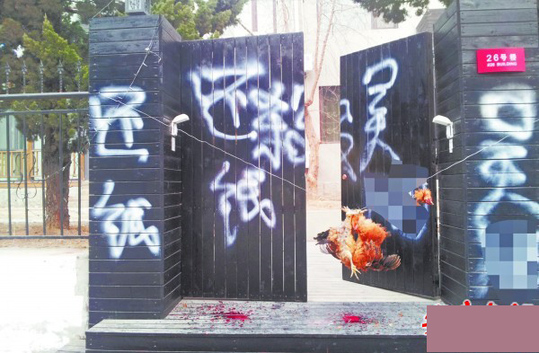 大院門口被噴了油漆,掛上死雞。(李先生提供) 10日凌晨4時許,臺灣路9號26號樓的院門口被人用白色油漆噴滿“還錢”、“殺”等大字,院內(nèi)也被投擲了多個“油漆彈”,更恐怖的是對方還在門口掛上了兩只剁了頭的死雞,雞血滿處都是。門口監(jiān)控錄像顯示,當(dāng)時有3名蒙面男子在此處噴字掛死雞。11日下午,在此處工作的李先生向記者反映了此事,并稱已經(jīng)報警。 11日下午,記者聞訊趕到事發(fā)地,這里是一個單位。此時大門上的油漆已經(jīng)被清理,但門前的臺階上以及院內(nèi)的走廊里還留有大片油漆印記。記者從李先生拍攝的照片看到,大院的兩扇大門以及門框上被人用白色油漆噴上了“還錢”等字眼,其中有一個“殺”字,院門口還被人用鐵絲穿了兩只砍了頭的死雞掛在大門中間,兩個雞頭也被穿在了鐵絲上,地上、大門等處滿是血跡,場面顯得非常血腥恐怖。 李先生最先發(fā)現(xiàn)了這一幕?!?0日早上我來單位上班,一進胡同就看到院門上被噴了油漆?!崩钕壬f,當(dāng)時發(fā)現(xiàn)門口掛著的兩只死雞還在滴血,他隨后趕緊匯報給了單位領(lǐng)導(dǎo)。為了防止上班的女同事被這一幕嚇到,他提前在胡同口處等候,并挨個提醒讓她們有心理準(zhǔn)備。即使這樣,仍有兩個女同事嚇得沒敢進大院,直接請假回家了,還有一個女同事提前下班了。 大院門口安裝有監(jiān)控,錄下了噴漆過程,監(jiān)控顯示,是3名男子于10日凌晨4時許來到門口噴漆?!翱赡苁且归g的光線不好,加上他們都戴著帽子并蒙著面部,根本看不清是誰。”李先生說。記者從監(jiān)控錄像看到,三名男子步行來到院門前,往院門上噴漆,接著三人用刀具將兩只活雞的雞頭剁了下來,把雞和雞頭掛到了門前的鐵絲上。一人拿出手電筒照著,另外兩人竟還掏出手機拍照錄像。臨走時,他們還朝大院內(nèi)扔了幾個“油漆彈”。 李先生說,他們已經(jīng)在事發(fā)當(dāng)天報警,目前警方正在調(diào)查此事。該單位負(fù)責(zé)人吳先生的名字也被噴到了院門上,對此,吳先生說目前無法確定此事是誰干的,但根據(jù)“還錢”字眼,此事能確定懷疑對象。吳先生說,他是一名外地人,在青島做生意很多年了,自己的單位此前跟青島一家公司一直有一些經(jīng)濟糾紛沒有解決,因此懷疑是對方所為。吳先生希望對方通過正常途徑解決糾紛。記者了解到,目前警方正在對此事進行調(diào)查。 |