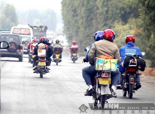 廣西新聞網(wǎng)訊(記者 周軍 文/圖) 1月11日,連續(xù)幾天的寒冷陰天終于停歇,氣溫也有回升……趁著這樣的好天氣,當天記者在南寧市的西郊出城路段和南百二級公路上看到,一輛輛掛著廣東車牌、云南車牌的摩托車,滿載著回家購買的年貨和簡單的家當,向西、向西、向著回家的路飛馳著(如圖)。 在南百二級公路隆安縣境內路邊,一位在路邊小憩的摩托車手告訴記者,9日,他們見到天氣漸好,就于當天下午從打工地廣東東莞市出發(fā),取道廣東湛江回到廣西,準備在11日下午回到百色那坡縣的家中過春節(jié)。截至記者發(fā)稿時,天空又下起了小雨,不過一切正常的話,這些在路上飛馳的摩托車手們應該已經回到了溫暖的家里。 |