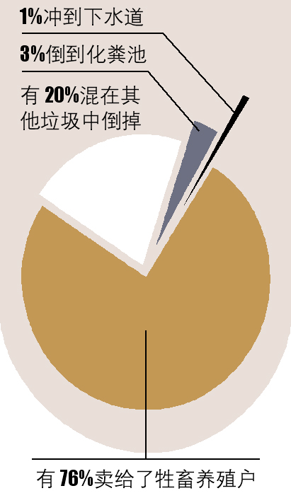 在白云區(qū)一養(yǎng)豬窩棚里的豬。2011年12月12日攝 “潲水豬”成本比“飼料豬”省近半 養(yǎng)豬戶為省成本收潲水并自煮潲水喂豬 潲水“產(chǎn)業(yè)鏈”調(diào)查 盡管《廣州市餐廚垃圾處理管理辦法》明確,餐飲垃圾(潲水)不能售賣給無(wú)證照個(gè)人,未經(jīng)無(wú)害化處理禁止用作畜禽飼料,然而本報(bào)記者在上個(gè)月近一個(gè)月的調(diào)查發(fā)現(xiàn),目前酒樓食肆、單位飯?zhí)玫人较掳唁唤o潲水佬的現(xiàn)象仍相當(dāng)普遍,而潲水佬收集潲水后,大多是運(yùn)回到養(yǎng)豬場(chǎng)喂養(yǎng)豬只。 記者調(diào)查發(fā)現(xiàn):養(yǎng)豬戶每月大約花上千元收潲水喂豬,比起只用飼料喂養(yǎng),成本能節(jié)省40%~50%。在利益的驅(qū)動(dòng)下,潲水不僅被用來(lái)喂豬,還用來(lái)喂雞和喂鴨。這些“潲水豬”“潲水鴨”通過(guò)交易市場(chǎng)流入市面。專家指出,盡管潲水經(jīng)過(guò)蒸煮但質(zhì)量仍無(wú)得到有效控制,容易導(dǎo)致豬只亞硝酸鹽中毒,若通過(guò)私宰途徑流入市面,將引發(fā)食品安全事件,此外“潲水豬”還存在破壞食物鏈的潛在危害。 《廣州市餐廚垃圾處理管理辦法》雖然已經(jīng)通過(guò),但實(shí)施時(shí)間卻一直未明朗。廣州市城管委負(fù)責(zé)人透露,目前已正在根據(jù)《廣州市餐廚垃圾處理管理辦法》制定操作細(xì)則,目前面臨的難題主要是,大量的餐飲垃圾的處理終端還沒(méi)跟上。城管人士透露,操作細(xì)則及實(shí)施方案已經(jīng)成稿,但還要走征求意見(jiàn)等程序,為政策推行更順利,會(huì)選取部分單位酒樓先做試點(diǎn)。 第一部分:潲水收運(yùn)調(diào)查 收運(yùn)暗訪一:晚上10點(diǎn)潲水車滿街跑 在人民路上,聚集了大大小小的酒樓食肆超過(guò)20家,也有多個(gè)單位企業(yè)的員工飯?zhí)?,因此,人民路也成為潲水佬收集潲水的一大陣地。晚?0點(diǎn)開(kāi)始,路上的潲水佬就開(kāi)始“活躍”起來(lái),從人民北路開(kāi)始到人民南路,沿路都有一輛輛改裝過(guò)的三輪摩托車從機(jī)動(dòng)車道上飛馳而過(guò)。 這些三輪摩托車基本都只由一名潲水佬駕駛,后面設(shè)有小型貨架,上面放著一個(gè)個(gè)1米多高的潲水桶,一輛三輪摩托車最多時(shí)載有5個(gè)潲水桶。 記者跟蹤時(shí)細(xì)數(shù)了一下,從人民北路到人民南路,一路下來(lái)最多時(shí)有10輛潲水車。這些潲水車或隨意??吭诼愤叄蛟跈C(jī)動(dòng)車道最右邊位置快速而行,有的甚至在機(jī)動(dòng)車道上逆行,以至過(guò)往車輛都要紛紛避讓,險(xiǎn)象環(huán)生。有市民告訴記者,潲水車的這種狀況在人民路上早已是見(jiàn)怪不怪,由于食肆眾多,因此也吸引了大量潲水車前來(lái)收集潲水。“潲水車基本都是"單兵作戰(zhàn)",一輛電動(dòng)三輪車加上幾個(gè)潲水桶,就可上路。”附近居民說(shuō)。 解放路通往三元里一段路的情況同樣有過(guò)之而無(wú)不及。 記者在大北立交觀察,短短5分鐘,就有8輛潲水車從記者面前飛馳而過(guò),當(dāng)中更有兩輛潲水車并排而行,兩輛車上的潲水佬一邊駕車一邊談笑風(fēng)生。有潲水佬向記者透露,由于不少潲水佬都是來(lái)自白云區(qū)、花都區(qū)的養(yǎng)豬戶,他們晚上從市區(qū)收集潲水后,就需要趕回養(yǎng)豬場(chǎng)將潲水存放,所以解放路、三元里一帶成了潲水車來(lái)往市區(qū)食肆餐館和郊區(qū)養(yǎng)豬場(chǎng)的必經(jīng)之路。 收運(yùn)暗訪二: 每個(gè)潲水佬各有地盤(pán) 經(jīng)過(guò)幾個(gè)晚上的跟蹤,記者成功跟蹤一名養(yǎng)豬戶收潲水的全過(guò)程。一個(gè)周日晚上10時(shí)左右,記者在人民中路一家湘菜館外看到,菜館結(jié)束了首輪晚市,一輛潲水車靠邊停在酒樓食肆門(mén)口,正當(dāng)潲水佬準(zhǔn)備下車,餐館服務(wù)員示意餐館還沒(méi)有將潲水清理完,于是潲水佬驅(qū)車離開(kāi)。記者繼續(xù)跟隨這輛潲水車,只見(jiàn)這輛潲水車沒(méi)走多遠(yuǎn),又??吭谝患倚∈车觊T(mén)前,同樣收集了一桶潲水。之后潲水車轉(zhuǎn)入了光孝路,從一家拉面館里收集了一桶潲水,該潲水非常油膩,而且傳出陣陣辛辣味道。 之后,潲水車掉轉(zhuǎn)車頭,以飛快速度又來(lái)到人民北路一家湘菜館,但這家湘菜館已經(jīng)關(guān)門(mén),潲水佬在門(mén)口敲門(mén)許久依然未有人應(yīng)答。潲水佬離開(kāi)這家湘菜館后,又掉轉(zhuǎn)方向折返回前面那家人民中路的湘菜館。這時(shí),湘菜館的潲水似乎已經(jīng)準(zhǔn)備好了,潲水佬就左右提著兩個(gè)小空桶進(jìn)入餐館,徑直走向廚房位置,大約十幾分鐘的時(shí)間,潲水佬就從菜館出來(lái),兩個(gè)小空桶里已經(jīng)裝滿了潲水。潲水佬將潲水倒進(jìn)車上的潲水桶。就這樣來(lái)回幾次,將菜館的潲水收集完后,潲水佬就駕車離開(kāi),往下一個(gè)酒樓食肆駛?cè)?。大約收集了6家食肆菜館的潲水后,潲水佬就打道回府,駕駛著潲水車快速地向白云區(qū)方向駛?cè)ァ?/p> 人民中路上的湘菜館店員告訴記者,每晚10時(shí)左右,潲水車都會(huì)準(zhǔn)時(shí)到達(dá),然后將廚房里的潲水全部收集運(yùn)走。 記者觀察發(fā)現(xiàn),每一戶潲水佬都有固定幾家酒樓食肆收集潲水,一般經(jīng)過(guò)一兩個(gè)小時(shí)后,每一戶的潲水佬都能滿載
