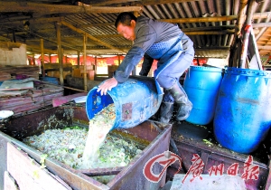在白云區(qū)一養(yǎng)豬窩棚,這位養(yǎng)豬戶將一早用三輪車收集回來(lái)的潲水集中倒在一起。 2011年12月12日攝