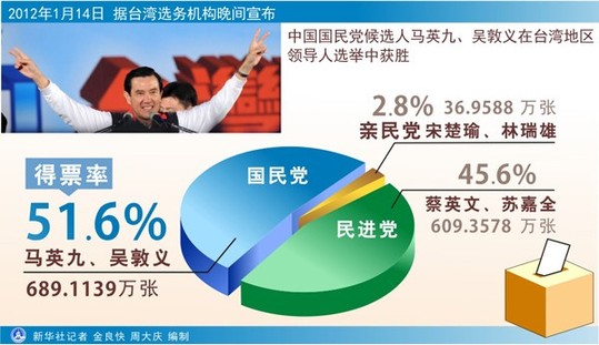 新華網(wǎng)臺北1月14日電 臺灣地區(qū)領(lǐng)導人選舉投票14日下午4時結(jié)束。開票結(jié)果顯示,中國國民黨候選人馬英九、吳敦義獲勝,得票6891139張,得票率為51.6%。