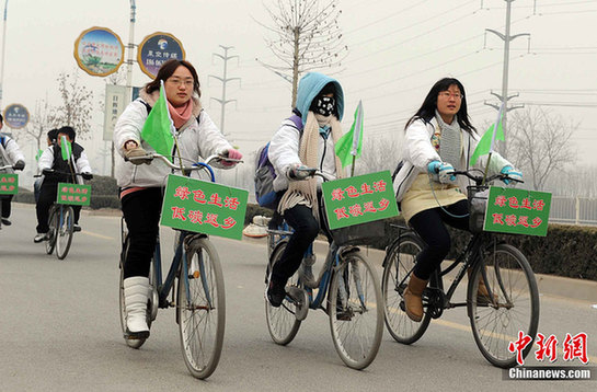 1月14日,山東聊城大學(xué)環(huán)境與規(guī)劃學(xué)院30余名聊城籍學(xué)子自發(fā)組織,騎自行車返鄉(xiāng)回家,倡導(dǎo)低碳生活。中新社發(fā) 董光強(qiáng) 攝