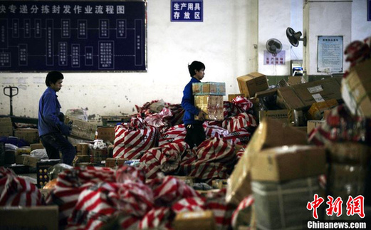 1月15日,重慶渝北區(qū)龍頭寺中國郵政快遞分揀處,春節(jié)臨近中國郵政快遞爆倉。春節(jié)臨近快遞業(yè)務(wù)量大幅度增加,倉庫里堆滿了等待分發(fā)的快遞物品。