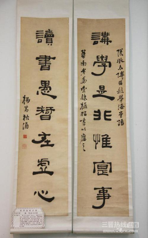 楊? 篤隸書對聯(lián) 楊? 篤(1834年—1894年):清咸豐時鄉(xiāng)寧縣人。同治中舉后,赴北京復(fù)試,獲潘祖蔭贊賞。此后得與吳大澂、李若農(nóng)等金石家來往,學(xué)益大進(jìn)。歷任代州、五臺等十?dāng)?shù)縣志主編,后任山西通志局纂修,適總纂王軒病故乃接任,終將《山西通志》編成刊行。工書法,古樸大雅,為人所重,成一時大家,在山西書法史上有繼往開來之功績。???
