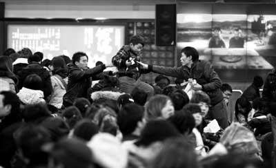 ????一名男子在人群中抱起孩子傳給同伴。昨日,北京西站候車(chē)室,旅客準(zhǔn)備進(jìn)站。本報(bào)記者 周崗峰 攝