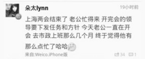 網(wǎng)友根據(jù)“朵太lynn”的微博,扒出了讓人無比羨慕的“幸福生活”。1月16日,“朵太lynn”寫道:“上海兩會結(jié)束了,開完會的領(lǐng)導(dǎo)要下發(fā)任務(wù)和方針,今天老公一直在開會,去市政上班那么幾個月,終于覺得他有那么點忙了……”另外,進(jìn)口美食、浪漫出游,還有年底近萬元的購物小票等,通通都是“朵太lynn”的微博內(nèi)容。