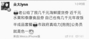 昨日,微博上最火的,是一位自稱上海某公務(wù)員的嬌妻網(wǎng)友“朵太lynn”?!岸涮玪ynn”一詞以近17萬的搜索量,霸占著微博昨日“熱搜榜”第一位,起因是她在微博寫道:“老公給了我?guī)浊гur提貨券,近千元水果和泰康食品券,自己也有幾千元年夜飯半成品套餐,市政府真給力,公務(wù)員就是色……”(編者注:疑為‘公務(wù)員就是好’)原微博一發(fā)出,一小時內(nèi)就有1000多次轉(zhuǎn)發(fā),“朵太lynn”迅速有了火爆網(wǎng)絡(luò)的名字“提貨姐”。有網(wǎng)友留言:“姑娘,你要害死你老公??!”還有網(wǎng)友調(diào)侃:“不怕神一樣的反貪,就怕豬一樣的老婆……”