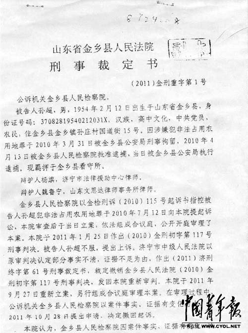 檢察院對(duì)孫超作出的撤訴裁定書(shū)。本報(bào)記者 莊慶鴻攝 老支書(shū)涉嫌非法占用農(nóng)用地被拘留 春節(jié)將至,山東省濟(jì)寧市金鄉(xiāng)縣金鄉(xiāng)街道孫莊村的村民們,牽掛著兩年沒(méi)能回家過(guò)年的老支書(shū)孫超。 兩年前當(dāng)時(shí)56歲的孫超是這個(gè)“大蒜之鄉(xiāng)”退下來(lái)的老村支書(shū),正和家人安享晚年。 就在2010年年初,他所在的孫莊村被列入金鄉(xiāng)縣地產(chǎn)開(kāi)發(fā)的序列。由于村民對(duì)拆遷補(bǔ)償有異議,決定要向縣里“議價(jià)”。 2010年3月,根據(jù)縣政府指示,村民通過(guò)投票選出了17名村民代表,代表全村就征地補(bǔ)償一事與縣政府、鎮(zhèn)政府協(xié)調(diào)交涉。 2010年3月30日下午,作為孫莊村選出的“村民總代表”,孫超與其他十幾名代表一道前往政府,與縣政府和鎮(zhèn)政府的負(fù)責(zé)人協(xié)商拆遷事宜。 當(dāng)天下午4時(shí)左右,就在會(huì)議現(xiàn)場(chǎng),孫超被縣公安局的警察帶走。 第二天,老支書(shū)的家人接到了刑事拘留通知書(shū)。半個(gè)月后的4月13日,金鄉(xiāng)縣人民檢察院以涉嫌“非法占用農(nóng)用地罪”為由,批捕了孫超。 撤訴之后不放人 這一關(guān)押,就是兩年。 2010年7月9日,金鄉(xiāng)縣人民檢察院向金鄉(xiāng)縣人民法院提起訴訟,指控孫超于1997年至2002年期間,在建設(shè)自家冷庫(kù)、化肥廠時(shí)少批多占了耕地7146平方米(合10.72畝),觸犯了《刑法》第342條,涉嫌構(gòu)成“非法侵占農(nóng)用地罪”。 2011年1月25日,金鄉(xiāng)縣人民法院作出了一審判決:孫超犯非法占用農(nóng)用地罪,判處有期徒刑兩年,并處罰金2000元。 令人匪夷所思的是,起訴中存在的一個(gè)明顯漏洞,沒(méi)被法庭發(fā)現(xiàn)。 那就是“超過(guò)追訴時(shí)效”。檢察院起訴孫超占用耕地的時(shí)間為1997年至2002年。根據(jù)《刑法》第342條的規(guī)定,“非法占用農(nóng)用地罪”的法定刑為“五年以下有期徒刑或者拘役,并處或者單處罰金”?!缎谭ā返?7條關(guān)于追訴時(shí)效期限的規(guī)定是:犯罪法定最高刑為不滿(mǎn)五年有期徒刑的,經(jīng)過(guò)五年期限不再追訴。 金鄉(xiāng)縣人民檢察院于2010年的起訴已超過(guò)了訴訟時(shí)效,為何還能判罪?如此明顯的追訴時(shí)效問(wèn)題,在一審中未被提及。 孫超不服一審判決,向濟(jì)寧市中級(jí)人民法院提起了上訴。 最終,濟(jì)寧市中級(jí)人民法院裁定“原審判決部分事實(shí)不清、證據(jù)不足”,撤銷(xiāo)金鄉(xiāng)縣人民法院的一審判決,將案件發(fā)回重審。 2011年9月27日,金鄉(xiāng)縣人民法院重新立案,另行組成合議庭審理孫超涉嫌非法占用農(nóng)用地罪一案。 2011年10月28日,公訴機(jī)關(guān)金鄉(xiāng)縣人民檢察院以“事實(shí)、證據(jù)有變化”為由,向金鄉(xiāng)縣人民法院提出申請(qǐng),決定撤回起訴。金鄉(xiāng)縣人民法院于當(dāng)天作出了“準(zhǔn)予撤訴”的裁定。 這次,孫莊村村民們終于松了口氣:“檢察院都撤訴了,老支書(shū)總可以無(wú)罪釋放了吧?” 根據(jù)最高人民檢察院2007年發(fā)布的《關(guān)于公訴案件撤回起訴若干問(wèn)題的指導(dǎo)意見(jiàn)》,檢察院撤訴后應(yīng)在七天內(nèi)作出不起訴決定,或者將案件退回偵查機(jī)關(guān)補(bǔ)充偵查。對(duì)于退回偵查的案件,檢察院也應(yīng)當(dāng)督促偵查機(jī)關(guān)變更強(qiáng)制措施。金鄉(xiāng)縣檢察院的撤訴,意味著孫超至少可以回家了。 然而,一天過(guò)去了,七天過(guò)去了,孫超沒(méi)有被釋放,家人也一直沒(méi)有得到變更強(qiáng)制措施的通知。孫超的家屬多次去金鄉(xiāng)縣人民檢察院要求放人,均未得到處理。 孫超的妻子問(wèn)檢察院工作人員:“不是已經(jīng)判了無(wú)罪,為啥還不能放出來(lái)?如果你們?cè)俨槌鏊惺裁醋铮捶?,也?yīng)該放出來(lái)再關(guān)進(jìn)去??!這還要等多久?一個(gè)月嗎?” 檢察院工作人員回答:“不可能,不可能那么晚,你們?cè)俚葞滋?。?/p> 直到記者發(fā)稿時(shí),“請(qǐng)命老支書(shū)”仍然被羈押在金鄉(xiāng)縣看守所。 “重新偵查”僅用一天 期盼老支書(shū)回家的家人不會(huì)想到的是,2011年12月14日,檢察院再次向法院提起公訴,指控孫超涉嫌“非法占用農(nóng)用地罪”。 而記者看到,在金鄉(xiāng)縣檢察院新一次的起訴書(shū)中,這樣寫(xiě)道:“本院撤回起訴后,于2011年11月4日將案卷退回金鄉(xiāng)縣公安局,并提出重新偵查建議。金鄉(xiāng)縣公安局重新偵查新的證據(jù)后于2011年11月5日將該案件移送至本院審查起訴……”也就是說(shuō),公安局重新偵查新的證據(jù)只用了1天時(shí)間。 最高人民法院1998年頒布的《最高人民法院關(guān)于執(zhí)行〈中華人民共和國(guó)刑事訴訟法〉若干問(wèn)題的解釋》第117條規(guī)定:“人民法院裁定準(zhǔn)許人民檢察院撤訴的案件,沒(méi)有新的事實(shí)、證據(jù),人民檢察院重新起訴的,人民法院不予受理?!?/p> 記者對(duì)比了金鄉(xiāng)縣人民檢察院分別于2010年7月、2011年12月前后兩次起訴孫超的起訴書(shū)發(fā)現(xiàn):兩份起訴書(shū)除了時(shí)間和記敘起訴階段的部分之外,幾乎一模一樣。唯一不同的地方在于,第一次的起訴書(shū)將指控孫超少批多占的7146平