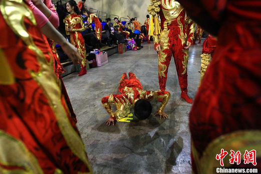 1月18日,記者在央視春晚排練的后場見到這么的一群人,默默的甘當綠葉,就為了臺上的那幾分鐘,而付出了臺下“十年功”。圖為幾名還未出場的舞蹈演員在后場練習。李建束攝
