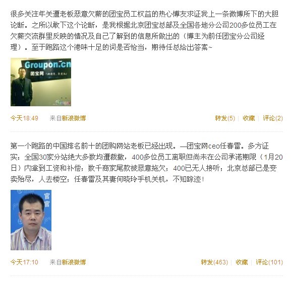 ![]() 團(tuán)寶農(nóng)民工微博截圖 ????1月24日晚間,據(jù)微博用戶團(tuán)寶農(nóng)民工爆料,中國排名前十團(tuán)購網(wǎng)站團(tuán)寶網(wǎng)CEO任春雷跑路,任及其妻何曉玲手機(jī)關(guān)機(jī),不知蹤跡。 ????他在微博上聲稱:“第一個(gè)跑路的中國排名前十的團(tuán)購網(wǎng)站老板已經(jīng)出現(xiàn)?!獔F(tuán)寶網(wǎng)ceo任春雷。多方證實(shí):全國30家分站絕大多數(shù)均遭裁撤,400多位員工離職但尚未在公司承諾期限(1月20日)內(nèi)拿到工資和補(bǔ)償;數(shù)千商家尾款被惡意拖欠;400已無人接聽;北京總部已是變賣殆盡,人去樓空;任春雷及其妻何曉玲手機(jī)關(guān)機(jī),不知蹤跡!” ????但是在隨后的微博中表示,任春雷跑路的論斷是根據(jù)北京團(tuán)寶總部及全國各地分公司200多位員工在欠薪交流群里反映的情況及自己了解到的信息所做出的。并期望任春雷回應(yīng)。目前任及團(tuán)寶官方尚無回應(yīng)。鳳凰網(wǎng)財(cái)經(jīng)試圖聯(lián)系相關(guān)人士,電話處于無法接聽狀態(tài)。 ????根據(jù)團(tuán)寶網(wǎng)網(wǎng)站資料顯示:團(tuán)寶網(wǎng)于2010年3月上線,2010年4月,團(tuán)寶網(wǎng)獲得金額為2000萬元人民幣投資。此后業(yè)務(wù)發(fā)展迅速,開通368座城市,截止2011年8月,總員工達(dá)2300人。 |