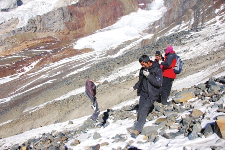“我們在海拔4700米的區(qū)域繼續(xù)搜尋,在下午3點30分左右,發(fā)現(xiàn)了一件藍色外套?!本仍牫蓡T說,衣服旁邊的雪地上,還有一些血跡。順著血救援隊伍上山搜救跡繼續(xù)尋找,救援隊成員在10多米開外的地上,找到了一具尸體?!敖?jīng)現(xiàn)場初步判斷,這具尸體是從700多米的高空下滑墜的,和楊某所說的意外發(fā)現(xiàn)地在三峰峰頂附近,是相吻合的。”