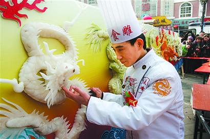 昨天,作為每年蘿卜會·元宵山會的標志性活動,《金龍獻瑞》全國蘿卜藝術(shù)雕刻大賽與精彩紛呈的開幕式演出同步進行。來自青島烹飪學校等學校的雕刻選手各顯神通,在他們的精心雕琢下,普通的蘿卜變成了 “松鶴延年”、“金魚戲蓮”等栩栩如生的藝術(shù)品。