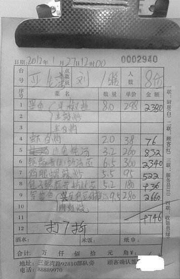 ????上述該負(fù)責(zé)人表示,為了防止欺客宰客的行為,三亞市工商局強(qiáng)迫各個(gè)海鮮排檔老板必須在下單時(shí)讓消費(fèi)者簽名,消費(fèi)者認(rèn)可后才能下廚。因此,現(xiàn)在網(wǎng)上很多消費(fèi)者曬出的菜單理論上可以拿到工商局投訴,但是如果菜單上已經(jīng)有消費(fèi)簽名,這就是合同關(guān)系。