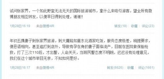 ![]() 微博截圖 大年初五,杭州游客楊先生與妻子王女士前往張家界旅游,在當(dāng)?shù)亍叭缫鈻|北人酒家”就餐時,因?yàn)樽詈笠槐P菜遲遲未上發(fā)生糾紛,轉(zhuǎn)而升級為肢體沖突。有孕在身的王女士被打后,面臨流產(chǎn)的危險。 無奈之下,楊先生只能發(fā)微博求助。在政務(wù)微博十大官員之一的龔厚欽等人關(guān)注下,事件引起了張家界市領(lǐng)導(dǎo)的重視,得到了進(jìn)一步解決。 昨天,本網(wǎng)對此事進(jìn)行了詳細(xì)報道。 2月2日下午,楊先生和妻子王女士在同事的陪同下回到杭州,身心俱疲的夫婦倆暫時回家休養(yǎng),不便接受采訪。 陪同的同事金女士告訴記者,她是1月31日看到微博,才獲悉楊先生的遭遇。在電話聯(lián)系后,她和另外兩個同事一起前往張家界慰問楊先生夫婦,并幫助處理相關(guān)事宜。 由于張家界當(dāng)?shù)蒯t(yī)院的醫(yī)療條件有限,為了能有更好的保胎措施,昨天晚上12點(diǎn),他們一行5人抵達(dá)上海,在上海住了一晚,今天下午坐動車返回了杭州。 金女士說,一路上,王女士的肚子一直處于陣痛狀態(tài)。明天,楊先生夫婦將前往省立同德醫(yī)院進(jìn)行全面檢查和相關(guān)保胎措施。 金女士表示,該事件也暫時告一段落,目前最要緊的是王女士的治療問題。楊先生還是之前的態(tài)度,就是視回杭保胎治療的情況,再追究肇事者的法律責(zé)任。 今天,處理該案的張家界市永定公安分局永定派出所也通報了最新的處理情況。 2012年1月27日,王女士與餐館王某兩人因糾紛而引發(fā)治安案件,導(dǎo)致王女士懷孕三個月的胎兒產(chǎn)生一定的影響(具體程度以張家界市人民醫(yī)院的病例為準(zhǔn))。 鑒于此案特殊性,一時不能處理完畢,經(jīng)派出所辦案人員與雙方當(dāng)事人協(xié)商,暫作初步處理意見:派出所對以前微博中的不實(shí)之詞及時予以更正;由店主王某支付王女士因此事產(chǎn)生的費(fèi)用(含張家界市人民醫(yī)院的住院費(fèi)、酒店的住宿費(fèi)、王女士夫婦回杭州的兩張單程機(jī)票);孕婦王某回杭州接受進(jìn)一步的觀察治療;派出所妥善保管此事件的所有證據(jù),并根據(jù)保胎成功與否依法定性本案。 |