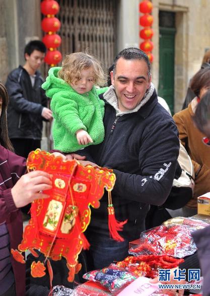 2月4日,在馬耳他首都瓦萊塔街頭,一位當(dāng)?shù)鼐用駧е⒆舆x購中國節(jié)日飾品。
