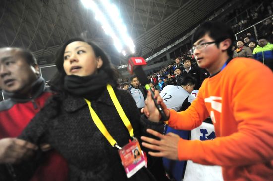 女記者被指粗暴對待志愿者 青島新聞網(wǎng)2月7日訊 2月5日晚,CBA聯(lián)賽戰(zhàn)罷倒數(shù)第四輪,青島男籃主場擊敗已經(jīng)躋身季后賽的勁旅北京隊。一個隨隊的北京女記者因?qū)Σ门械呐辛P不滿闖進球場,隨后引發(fā)一連串沖突,事件最終以鬧劇收場。比賽結(jié)束兩天了,但“女記者球場耍潑”事件卻成了微博的熱議話題。 讓我們把時間撥回到2月5日晚的比賽現(xiàn)場。由于馬布里有傷,也可能是已經(jīng)躋身季后賽讓球員有些放松,北京隊上半場完全處于落后的境地。第三節(jié)開始北京隊發(fā)起了反擊,但進攻稍有起勢球員就接連犯規(guī)和違例。北京隊外援莫里斯和青島外援奧德杰的一個身體接觸,裁判判罰莫里斯犯規(guī),此舉引發(fā)北京隊的強烈不滿,主教練閔鹿蕾上前與裁判理論又吃到技術犯規(guī)。 到這時比賽雖然激烈但仍在可控范圍內(nèi),接下來的一幕卻出乎很多人意料:一名北京的隨隊女記者在暫停階段直接進入場內(nèi)和裁判對話。事后據(jù)坐在她旁邊的一位青島記者回憶,這位女記者回來后和他同事說了一番耐人尋味的話,“我和他說要給他做個裁判專題,北京隊剛起勢就讓他給吹下去了?!?/p> |