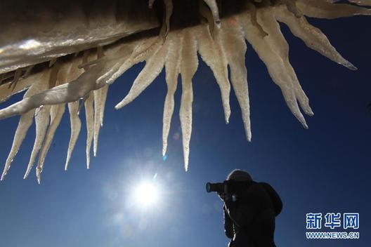 2月7日,游人在江蘇連云港海岸邊拍攝冰凌。新華社發(fā)(王健民攝)