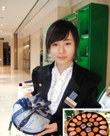![]() 銷售人員展示這盒內(nèi)含28顆巧克力,重量為300g,標價為8600元的“最貴巧克力”