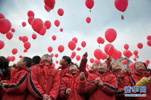 當(dāng)日是不少中小學(xué)寒假過后開學(xué)第一天,安徽省合肥市蜀山區(qū)蜀山小學(xué)千余名學(xué)生集體放飛寫有感恩話語的氣球。(新華社記者 郭晨攝)