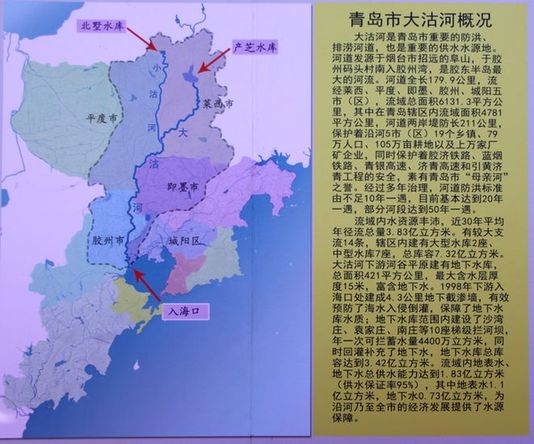 青島市大沽河概況 新聞鏈接:大沽河概況大沽河古稱“姑水”,是膠東半島最大的河流,發(fā)源于煙臺招遠阜山,干流全長179.9公里,流域總面積6131.3平方公里。大沽河在青島市域內干流長度約140余公里,流域面積約4781平方公里,約占青島市域總面積的45%。小沽河發(fā)源于煙臺萊州市南部大澤山區(qū),是大沽河的主要支流,水量較大,當?shù)赜小按蠊梁硬淮?,小沽河不小”的俗語。青島市域內的河流長度約60公里。 大沽河流域范圍大,支流較多,主要支流有小沽河、潴河、五沽河、流浩河、黃同河、豬洞河、落藥河、流浩河和南膠萊河。這些支流均為間歇性河流,每年斷流時間長,僅在雨季有水流。流域地形北高南低,地貌以低海拔沖積平原為主。大沽河流域范圍內共有50個鎮(zhèn)(街道辦事處),村莊2513個,總人口約240萬人,約占青島市總人口的27%。干流沿岸有27個鎮(zhèn)(街道辦事處),1480多個村莊、約137萬人。流域內雨量較充沛,多年平均降水量為675.6毫米,多年平均水資源總量9.10億立方米,占全市的41.18%。