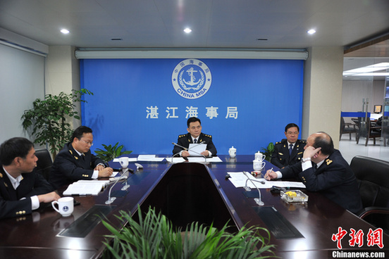 2月8日23點(diǎn)20分,擱淺于瓊州海峽海安新港航道西側(cè)距岸一海里處的客滾船“南方6號(hào)”成功脫淺,815名旅客和船員全部脫險(xiǎn)。圖為湛江海事局王建華局長(zhǎng)親自坐鎮(zhèn)指揮中心布置搜救措施。