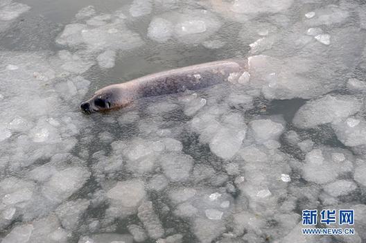 2月8日,在山東煙臺(tái)東炮臺(tái)海濱風(fēng)景區(qū)生態(tài)海豹灣,斑海豹在冰水中游動(dòng)。新華社發(fā)(初陽(yáng) 攝)