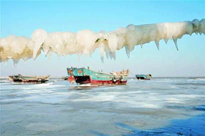 2月8日,山東青島膠州灣再次被海冰冰封,漁船被“釘”在冰面。