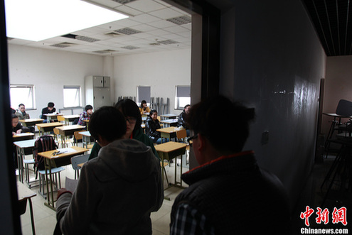 2月12日上午,2012北京電影學(xué)院藝考文學(xué)系、導(dǎo)演系、攝影學(xué)院開(kāi)始初試,表演學(xué)院則開(kāi)始了為期13天初試、復(fù)試和三試的藝考“長(zhǎng)跑”。圖為文學(xué)系考場(chǎng)。