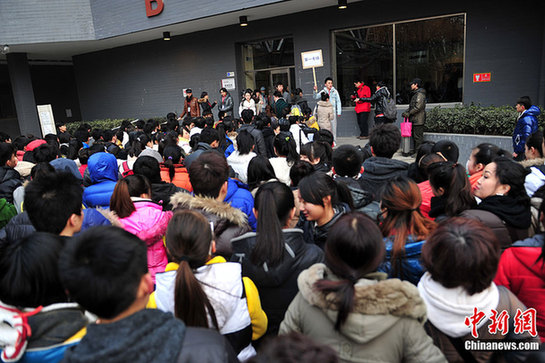 2月12日上午,2012北京電影學院藝考文學系、導演系、攝影學院開始初試,表演學院則開始了為期13天初試、復試和三試的藝考“長跑”。圖為考生排隊等待入考場初試。