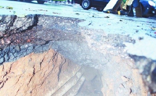 ![]() 大坑周圍部分路面已經(jīng)懸空,漏水管道周邊形成了一個大洞。