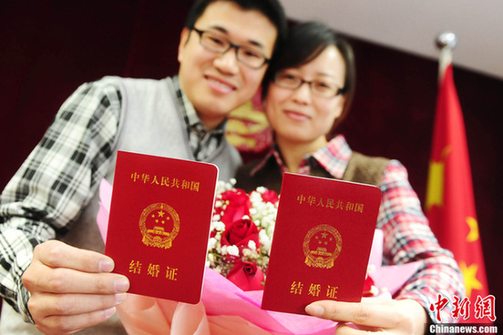 ![]() 2月14日,北京許多新人選擇在“情人節(jié)”當(dāng)天登記結(jié)婚。民政部門統(tǒng)計,全市預(yù)約“情人節(jié)”當(dāng)日登記領(lǐng)證的新人已達2100余對,預(yù)計14日全市“登記”的新人或?qū)⑼黄?000對,和去年“情人節(jié)”領(lǐng)證人數(shù)相當(dāng)。圖為在東城區(qū)婚姻登記處,左先生和相戀8年的女友葉小姐領(lǐng)取了結(jié)婚證。左先生提前買好了一大束玫瑰花,一大早便來到婚姻登記處排隊。他說,希望每天都是情人節(jié)。 |