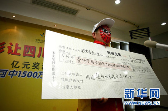 2011年5月30日,成都,帶著蜘蛛俠面具的南充彩民在四川體彩中心領(lǐng)取超級大樂透11769493元(稅后)獎金。5月28日晚開出的彩票超級大樂透第11061期南充一彩民憑借追加一元錢獲獎1471萬元,成為四川體彩史上第11位千萬大獎得主。