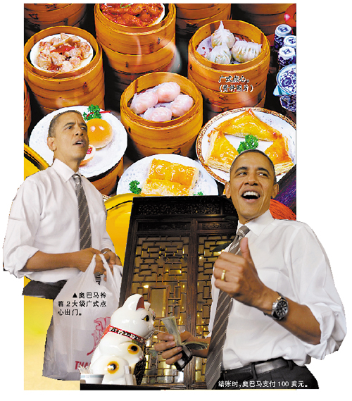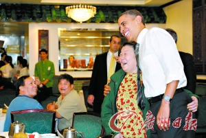 奧巴馬在餐廳與顧客合影。 ????當(dāng)?shù)貢r(shí)間2月16日中午約1時(shí)27分,舊金山中國(guó)城杰克遜街,著白襯衫系條紋領(lǐng)帶卷袖子的美國(guó)總統(tǒng)奧巴馬走進(jìn)迎賓閣飯店,向前臺(tái)經(jīng)理打招呼問(wèn)好,“請(qǐng)幫我準(zhǔn)備一些點(diǎn)心,打包帶走?!?/p> ????奧巴馬突然造訪 ????奧巴馬進(jìn)門時(shí),服務(wù)員阿梅正在上菜,她告訴記者,“先是一大批舉著相機(jī)和攝像機(jī)的人沖進(jìn)來(lái),鏡頭對(duì)著門口,我很驚訝。隨后奧巴馬走進(jìn)來(lái)向我們打招呼,展示招牌笑容,大家又意外又興奮,有的顧客喊‘奧巴馬,奧巴馬’,爭(zhēng)著和他握手拍照,他一一照辦?!?/p> ????迎賓閣飯店的東主李碩和及前臺(tái)經(jīng)理對(duì)記者說(shuō):“事先我們并不知道奧巴馬會(huì)來(lái),一點(diǎn)準(zhǔn)備都沒(méi)有。他進(jìn)來(lái)后大聲問(wèn)好,要我們幫他準(zhǔn)備一些普通點(diǎn)心打包帶走。” ????自掏腰包100美元 ????奧巴馬在迎賓閣逗留了約15分鐘,其間出門與街道上的圍觀民眾握手問(wèn)好。前臺(tái)經(jīng)理為奧巴馬裝了蝦餃、燒賣、叉燒包、豆苗和小籠包等廣式點(diǎn)心,大約8個(gè)飯盒分裝在兩個(gè)白色塑料袋里,上面印著紅色花朵和“謝謝”英文字樣,為此他錯(cuò)過(guò)了和奧巴馬拍照的機(jī)會(huì)。“奧巴馬掏出100美元,自己拎著兩大袋出門。” ????安保嚴(yán)格 ????記者在現(xiàn)場(chǎng)看到,大批媒體和保安與奧巴馬同行。單行道的杰克遜街在都板街和乾尼街路段被奧巴馬的車隊(duì)封鎖。除了迎賓閣,其余附近的店鋪均被要求關(guān)門,安保人員把守門口,人們隔著玻璃窗向外張望,喝彩拍照。(中新) ????一時(shí)興起逛中國(guó)城買廣式點(diǎn)心 ????本報(bào)訊 根據(jù)白宮事先公布的行程,當(dāng)天12時(shí)39分抵達(dá)舊金山國(guó)際機(jī)場(chǎng)的奧巴馬在舊金山有3場(chǎng)籌款活動(dòng)。 ????第一場(chǎng)是14時(shí)在馬克霍普金斯洲際酒店的小型私人籌款會(huì),下午在太平洋高地一個(gè)住所的籌款晚宴,晚上8時(shí)在美生堂與公眾見(jiàn)面,為競(jìng)選連任宣傳。舊金山市長(zhǎng)李孟賢、加州副州長(zhǎng)紐森等政要在機(jī)場(chǎng)迎接奧巴馬。奧巴馬的隨行新聞官告訴記者,奧巴馬是臨時(shí)決定到中國(guó)城逗留買廣式點(diǎn)心的。 ????3位舊金山市政府的華裔工程師在迎賓閣隔壁用餐,目睹奧巴馬短暫逗留。他們告訴記者:“今年總統(tǒng)選舉沒(méi)有更好選擇,我們會(huì)支持奧巴馬。希望他未來(lái)4年繼續(xù)降低失業(yè)率,關(guān)注公立教育,振興經(jīng)濟(jì)。” ????奧巴馬的舊金山之行是為競(jìng)選連任的西部系列活動(dòng)第一站。他明天北上西雅圖,南下洛杉磯繼續(xù)籌款。 |