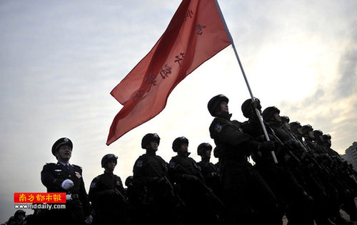 2012年2月17日,中山市打擊欺行霸市專項行動出征儀式在市全民健身廣場舉行,警方人員列隊出發(fā)。