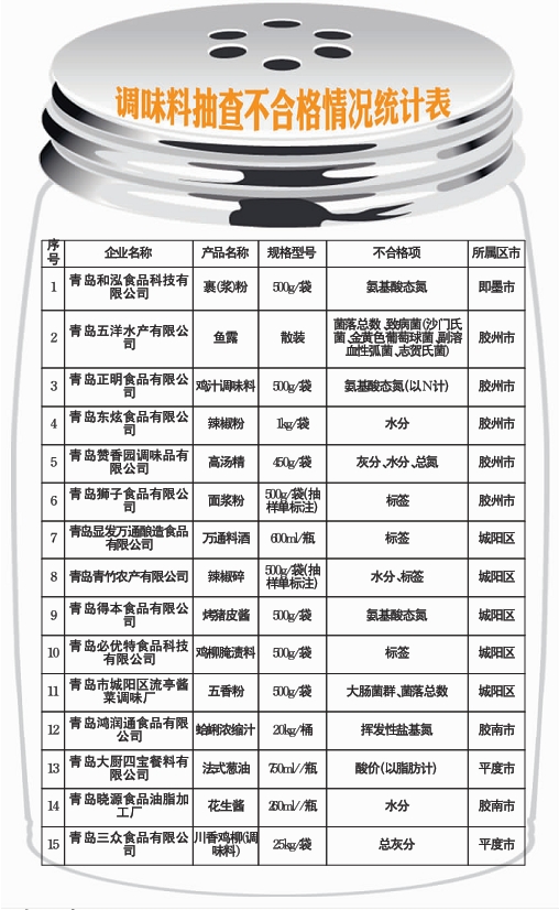 ????家家戶戶做菜都離不開調(diào)味品,可您知道家里的調(diào)味品到底合不合格?2月20日下午,青島市質(zhì)監(jiān)局在網(wǎng)站上公布了2011年兩節(jié)期間調(diào)味料產(chǎn)品質(zhì)量監(jiān)督抽查結(jié)果,本次共抽檢了54家企業(yè)的81批次產(chǎn)品,實物質(zhì)量合格率為85.19% 。其中15家企業(yè)的15款產(chǎn)品不合格,有兩家企業(yè)的兩款產(chǎn)品竟被檢出菌落總數(shù)超標(biāo)。 ????本次抽查的調(diào)味料產(chǎn)品,共抽查了54家企業(yè)的81批產(chǎn)品,36家企業(yè)未抽到樣品。根據(jù)相關(guān)的法律法規(guī)和行業(yè)標(biāo)準(zhǔn),本次抽檢共對灰分、總砷、鉛、黃曲霉毒素B、大腸菌群、細(xì)菌總數(shù)、致病菌、標(biāo)簽等22個質(zhì)量指標(biāo)進(jìn)行了抽樣檢驗,經(jīng)抽檢實物質(zhì)量合格率為85.19% 。 ????在被檢出不合格的15家企業(yè)的15種調(diào)味品中,青島五洋水產(chǎn)有限公司生產(chǎn)的散裝魚露和青島市城陽區(qū)流亭醬菜調(diào)味廠生產(chǎn)的飄流牌五香粉被檢出菌落總數(shù)超標(biāo)項目不合格。其他不合格產(chǎn)品被檢出氨基酸態(tài)氮不合格3項次、致病菌不合格1項次、水分不合格4項次、灰分不合格1項次、總氮不合格1項次、大腸菌群不合格1項次、揮發(fā)性鹽基氮不合格1項次、酸價不合格1項次、總灰分不合格1項次,并有6家企業(yè)的標(biāo)簽不合格,青島市質(zhì)監(jiān)局已按有關(guān)規(guī)定開展后處理工作。(記者 許永光) |