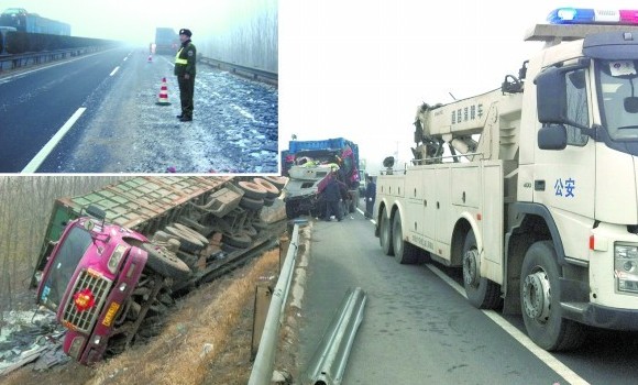 貨車追尾事故現(xiàn)場。(小圖為地上的碎玻璃) ????22日早上6時許,青銀高速青島方向發(fā)生一起貨車追尾事故,導(dǎo)致前車側(cè)翻至路邊溝內(nèi),車上運(yùn)載的38噸玻璃全被摔碎,碎玻璃撒落到高速路上,交通一度受阻,后車司機(jī)和一名隨車人員嚴(yán)重受傷。 ????據(jù)了解,22日早上6時許,河北邯鄲某運(yùn)輸公司的尹某,駕駛一輛滿載 38噸玻璃的東風(fēng)貨車去膠州送貨。當(dāng)其行駛至青銀高速K97+400M 處南側(cè)時,一輛掛著河北冀J號牌的解放牌貨車從后方疾駛而來。由于車速過高加上駕駛員疏忽大意,解放牌貨車在超車時撞在了東風(fēng)貨車右后部,巨大的撞擊力讓東風(fēng)車失去控制,在路上劇烈擺動之后,斜著沖向路邊護(hù)欄,最終側(cè)翻到路旁的深溝內(nèi)。 ????貨車上運(yùn)載的38噸玻璃全部被當(dāng)場摔碎,碎玻璃片撒落了100 平方米左右的路面。造成該路段交通一度受阻,車流通行緩慢。肇事車輛解放牌貨車的駕駛室也嚴(yán)重變形 ,駕駛員和一名隨車人員受傷嚴(yán)重,被卡在駕駛室內(nèi)無法動彈。 ????事故發(fā)生后,由于擔(dān)心被碎玻璃扎破車胎,在事發(fā)地點(diǎn)過往的司機(jī),大都小心翼翼地駕車躲避碎玻璃碴,加劇了該路段的壓車現(xiàn)象。 ????山東高速青島分公司路政值班人員接報后立即出動,啟動緊急事故應(yīng)急預(yù)案,在路上設(shè)置警示標(biāo)志并疏導(dǎo)交通。同時,通知119消防和120急救人員前來協(xié)助救助傷員。經(jīng)過通力協(xié)作,救援人員將駕駛員從變形的車體內(nèi)搶救出來,并送往醫(yī)院救治。 ????隨后,路政值班人員展開路面搶險救援,調(diào)集5名工人上路清掃碎玻璃,并調(diào)撥大型清障設(shè)備前來清障。直至上午10時許,事故現(xiàn)場清理完畢,受影響的高速路段恢復(fù)暢通。(記者馬正拓 通訊員張曉東 王玉忠) |